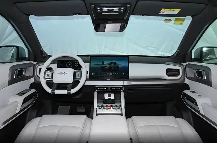 方程豹钛3的内部装饰继承了家族的设计风格,颜色搭配也相当清新。方向盘与方程豹豹5的设计基本一致,中央控制屏幕尺寸为15.6英寸。排挡杆区域采用了家族式的设计,并配备了大量的实体按键,给人一种非常机械的感觉。整体设计完全符合近两年的流行趋势。