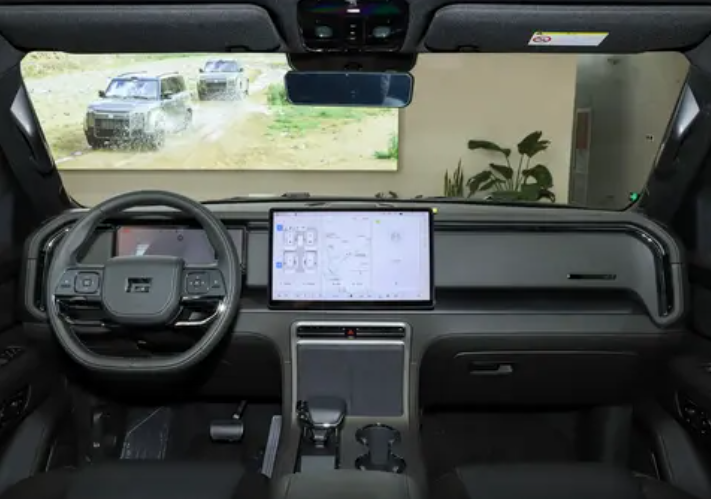 从外观上看,极石01与市面上那些流线型的新能源车型形成了鲜明对比。其车身线条硬朗,棱角分明,每一处细节都彰显着它纯粹的越野血统。前脸部分,方正的格栅设计简洁而有力,搭配大尺寸的品牌标识,彰显出强大的气场。两侧大灯组造型犀利,点亮后的辨识度极高,而前包围两侧的黑色网状进气装饰,则进一步提升了车辆的视觉冲击力。