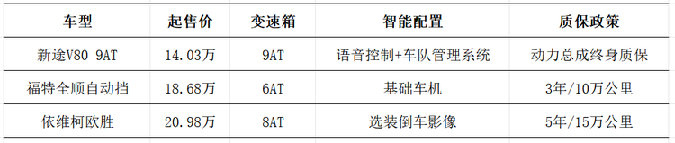 福特全顺自动挡起售价 18.68 万,依维柯欧胜 20.98 万,而新途 V80 9AT 只要 14.03 万。变速箱档位数量新途 V80 9AT 最多,智能配置也是它最丰富,还提供动力总成终身质保和终身保养服务权益,至高综合优惠可达4.2万元!