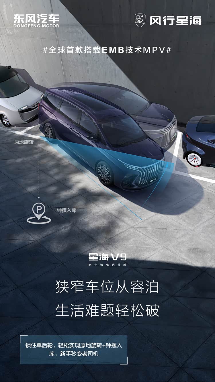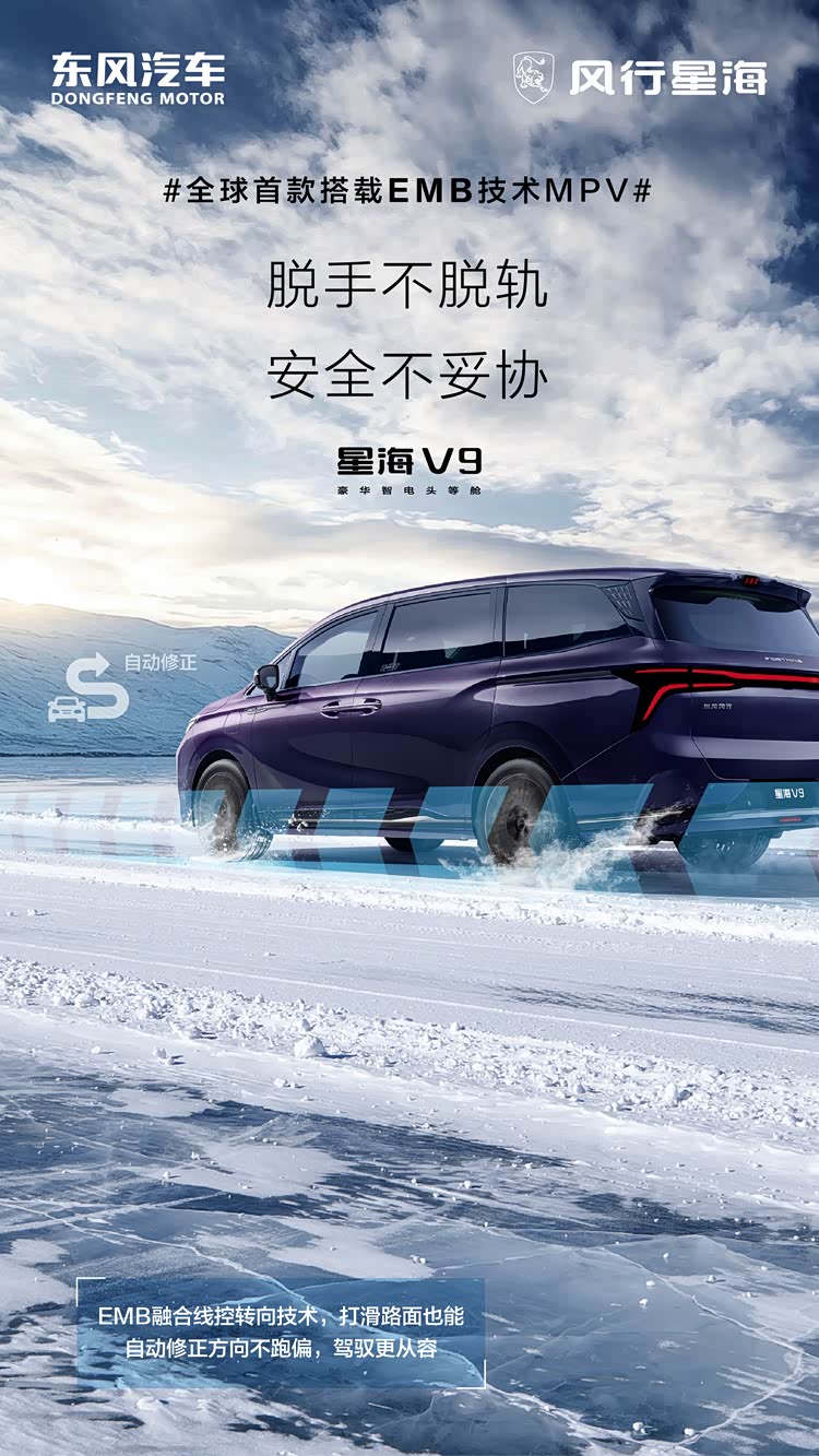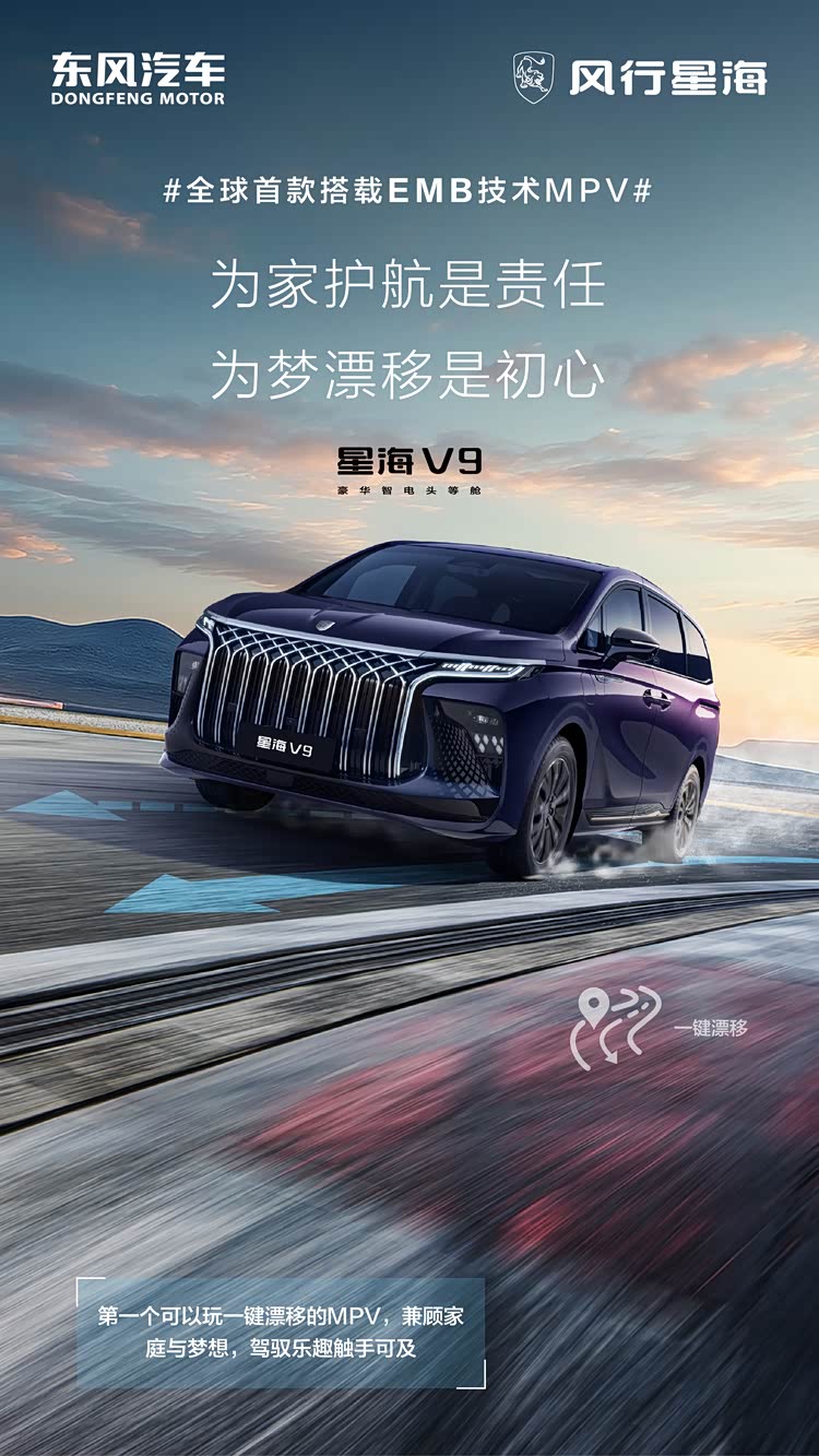 选择一辆MPV是照顾家庭的责任,但漂移才是每个中年男人年少时的梦想。我们不做选择题,既要责任,也要激情。星海V9的EMB系统不仅关注安全与舒适,更在驾驶乐趣上做出了创新。星海V9的EMB系统搭载智能漂移功能,让家庭守护者不仅能实现守护家庭的责任,还能实现 MPV一键漂移的激情与乐趣。通过监控驾驶员期望的横摆角速度,EMB系统能够主动调整后轮制动,实现车辆的侧滑,帮助驾驶者轻松应对各种驾驶场景。