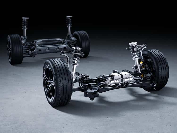 这套悬架系统不光包含了自适应阻尼减振和双阀双腔空气弹簧,还为每个车轮安装了电机系统,能通过扭力杆让车轮主动抬升/压低;再配合车身传感器对路况的实时扫描,就可以根据路面起伏调节车轮弹跳,从而主动迎合路面条件,做到座舱与路面在“Y轴”上的完全隔离。
