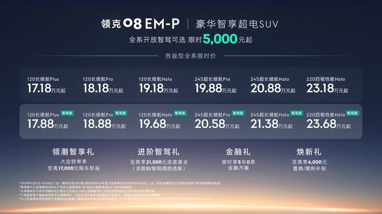 领克08 EM-P全系限时价17.18万元起,领克08 EM-P智驾版限时价17.88万元起,同样可享5年0息金融政策,月供低至50元起,购车成本降低近1.2万元。