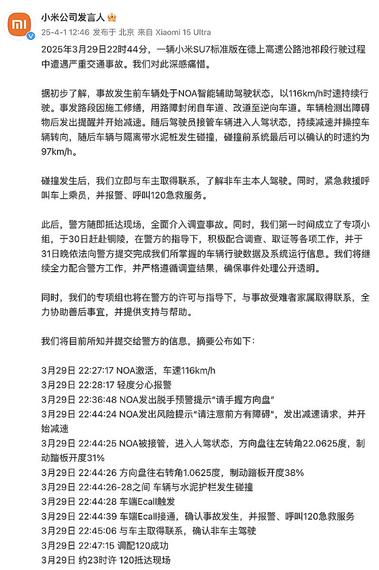 4月1日午间,小米公司发言人官微发文就“SU7高速碰撞爆燃”事故进行回应。