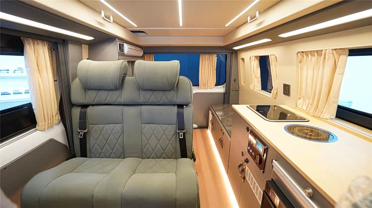 生活区的设计同样别具匠心。搏创福顺升顶露营车提供了2+2的座椅布局,可根据实际需求灵活调整。电动升降软平升顶带升顶双人床的设计,为露营者提供了宽敞的休息空间。二排多功能翻折座椅可拼成横纵床,进一步提升了车内空间的利用率。此外,车内还配备了隐私窗帘、床垫等,为露营者打造了一个私密的休憩环境。