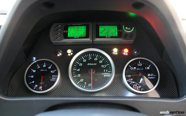 进入车内,基本维持原厂的状态,升级了一对RECARO运动座椅,而最标志性的“精工”仪表被拆除了,取而代之的DIY仪表组,包括了Defi改装三联表仪表(转速表/增压/排气温度),顶部还布置了Blitz升压控制器和电源监视器,可以让驾驶者对车辆运行状况一目了然。