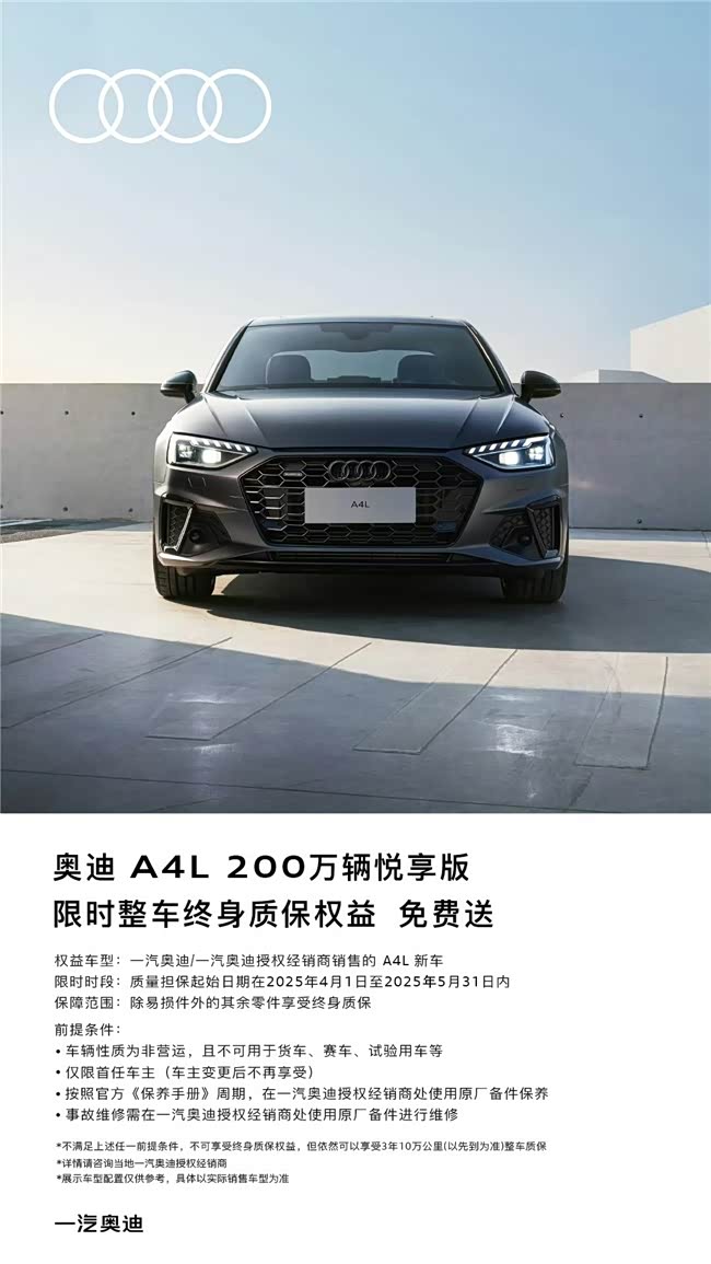 当时间来到2025年4月初,一汽奥迪宣布了一项令人振奋的消息:为了庆祝A4L累计销售达到200万台里程碑式的成就,公司决定推出 奥迪A4L(参数|询价) 200万辆悦享版车型,并正式推出限时免费终身质保政策。根据该计划,在接下来的一个多月时间内(截止至5月31日),凡是首次购车并用于个人使用的客户均可以享受到不限制使用期限或行驶距离的全面保修服务。此举不仅充分展现了企业对于自身产品可靠性的高度自信,也为广大用户带来了实实在在的利益。