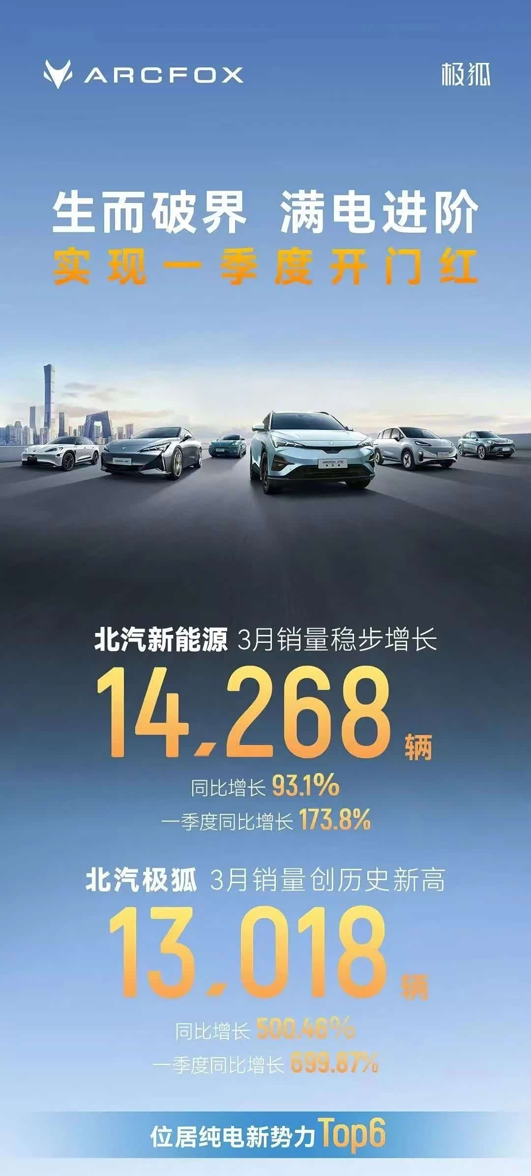 3月,极狐交付13018辆,同比增长500.46%,再创月度销量历史新高,位列纯电新势力TOP6。