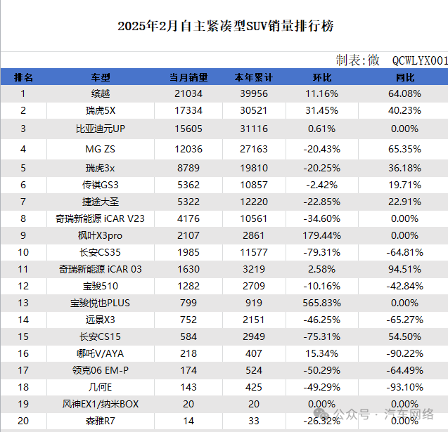2025 年 2 月自主紧凑型 SUV 销量排行榜数据显示,中国品牌正加速新能源转型与燃油车升级双线布局。上牌数据显示,缤越以 21,034 辆的单月销量领跑市场,其燃油版与插混版车型组合拳策略成效显著,环比增长 11.16% 印证市场热度持续攀升。值得关注的是,比亚迪元 UP 作为全新纯电车型首月即进入前三,销量达 15,605 辆,侧面反映消费者对小型 SUV 电动化接受度的提升。
