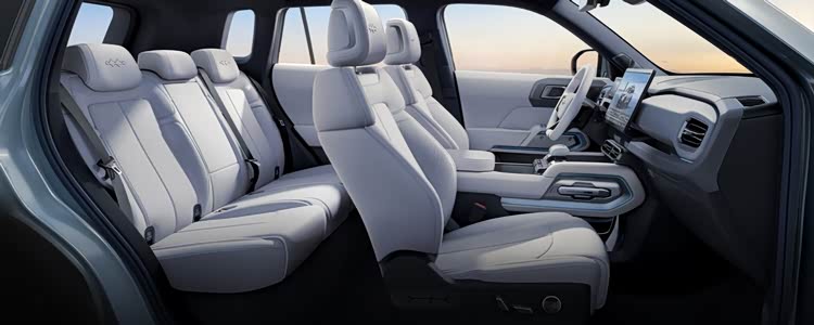 钛3的内饰采用浅色搭配未来主义设计风格,整体氛围简约而不失科技感。座舱内采用T型中控台、C形星际氛围灯与豹系家族同款的“战车挡把+水晶按键”,营造出硬派又极具质感的驾乘氛围。钛3搭载了15.6英寸悬浮式中控屏(入门版为12.8英寸),集成DiLink 100智能座舱系统,带来流畅、直观的交互体验。此外,钛3还提供车载冰箱、座椅通风加热、双层隔音玻璃等豪华配置,提升了驾乘的舒适性和便利性。