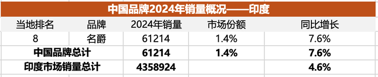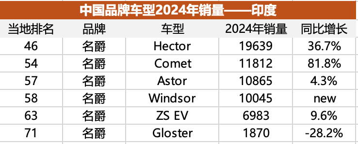 在这个400多万辆规模的市场中,中国品牌唯一有统计数据的,只有名爵,2024年在印度的销量超过了6.1万辆,份额1.4%。除此之外,就再无其它中国品牌能在印度产生存在感。