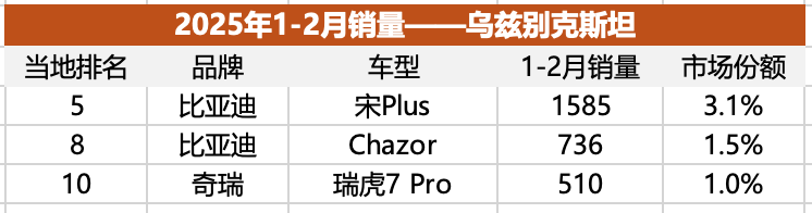 虽然没有2024年全年数据,但小编找到了今年1-2月乌兹别克斯坦的销量。该国两个月累计销量5万辆出头,可以推测全年销量也在20-30万辆的规模。