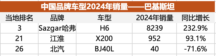 车型方面,哈弗在巴基斯坦的销量基本就是H6这一款车,其余还有江淮的X200和北汽的BJ40L,销量都要少得多。