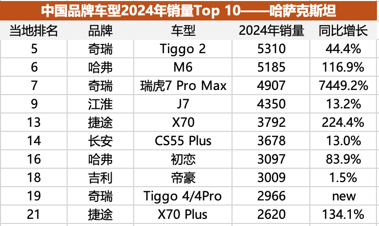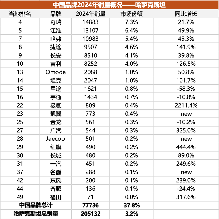 哈萨克斯坦的人口密度、经济情况,和俄罗斯都比较接近,虽然总计只有2千万人,但汽车销量数据非常完善,且中国车企在当地非常活跃,有销量数据的品牌,超过了20个。