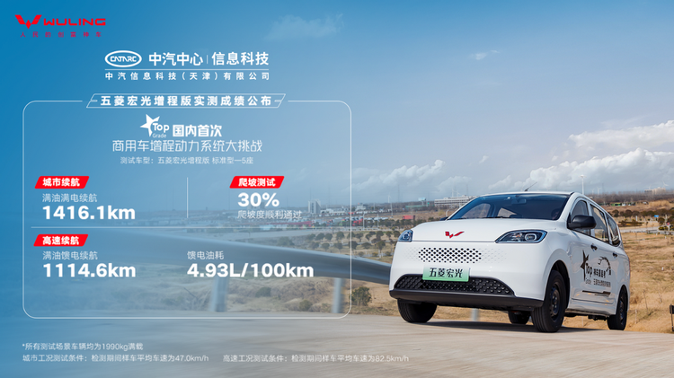 在中汽中心举办的国内首次商用车增程系统大挑战中,五菱宏光增程版续航及载货能力均表现优异。在城市路况下,满载状态的五菱宏光增程版满油满电续航里程达1416.1km,可轻松覆盖 "京津冀通勤圈" 往返需求;而在高速路况下,满油馈电状态续航里程达到1114.6km,相当于从广州直达长沙无需补能,且馈电油耗仅4.93L/100km。