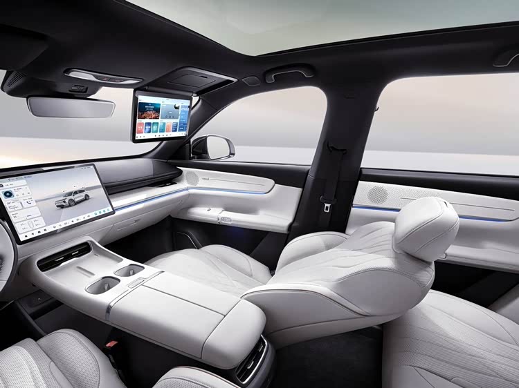 侧面采用悬浮式车顶和隐藏式门把手,搭配20英寸多辐轮毂,风阻系数低至0.258Cd,优化空气动力学表现。尾部环形贯穿尾灯,由181颗超红光LED组成,搭配熏黑LOGO和镀铬饰条,层次感鲜明。