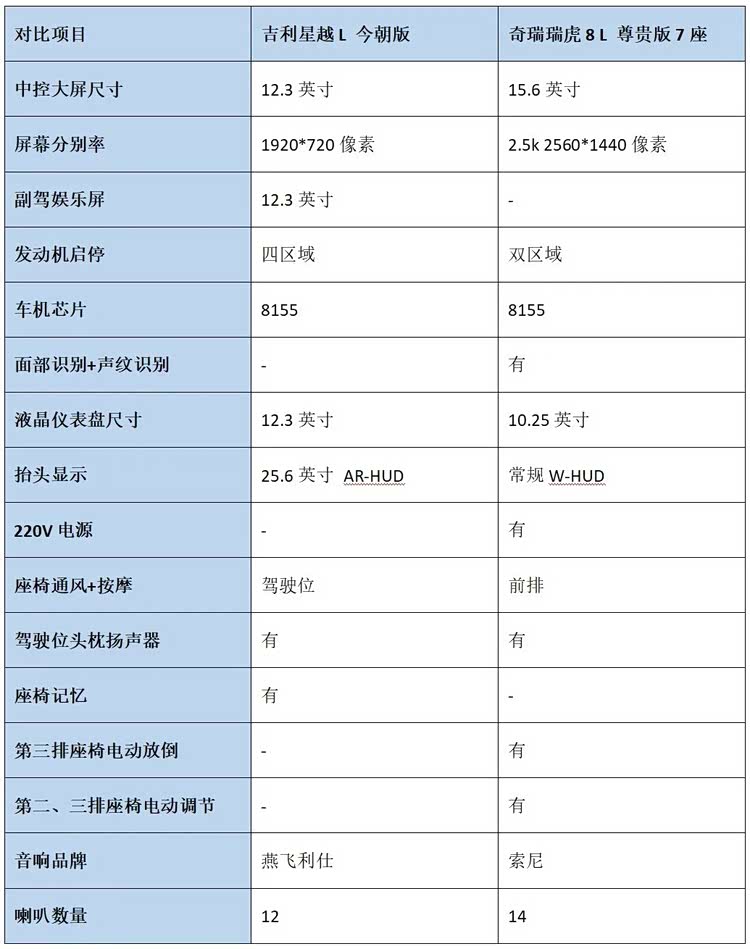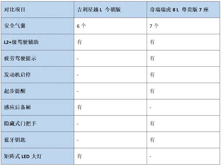 两车现在的现金优惠分别是1.5万和1.7万,所以在优惠后价格基本一样,这也让对比的意义更大了。瑞虎8 L轴距比星越L短,但车身三围是更大的,外形观感是挺大的,而我们虽然拿了它7座版本来对比,但它的三排空间也只是适合应急,更多还是因为这个版本配置很丰富。而星越L的东方曜版本是配备CCD可变阻尼悬挂的,这使得车辆在通过颠簸路面时的舒适性要更好一些。