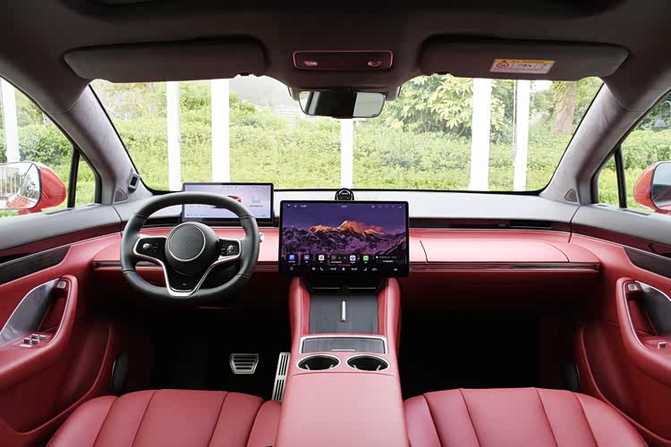 座椅是前排双零重力设计,坐垫长度够,对大腿前半部分承托到位,长时间开高速不容易累,标配了通风、加热和 12 向电动调节,通风风量分三档,夏天后背不会闷汗,加热速度也挺快,冬天着车几分钟就暖乎了。车顶的全景天幕虽然占了不少面积,但前排头部空间一点不挤,身高 180cm 的人坐正,头顶离天幕还有一拳多的距离,不会有压抑感,而且标配了电动遮阳帘,按钮就在前排阅读灯旁边,阳光强的时候一键就能调暗,不用担心晒头顶。方向盘支持四向电动调节,高低、前后调整范围挺大,不管是喜欢半躺着开还是坐直开,都能找到合适的坐姿,加上车身高度比 S7 高了 144mm,坐姿自然也高一些,前挡风玻璃的视野特别开阔,红绿灯前看左右来车也更清楚,整体前排的人机工程学设计挺贴合日常驾驶需求,配置都是实用为主,没有花里胡哨的噱头。