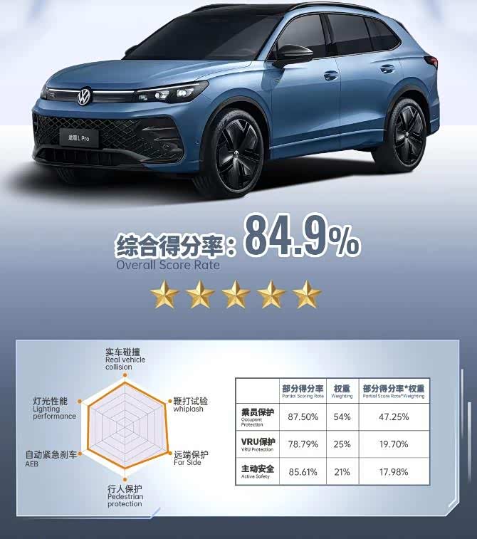 碰撞测试王者:2024款途观L在C-NCAP测试中以乘员保护87.5%、行人保护满分的成绩斩获五星安全评价,尤其在“远端保护”和“高速柱碰”等极端场景中表现堪称“教科书级别”。