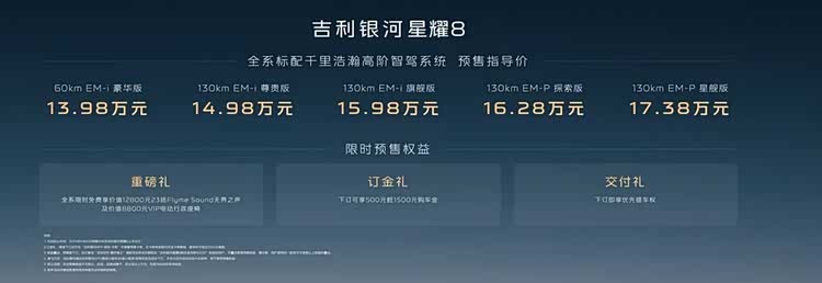 近日,吉利银河星耀8车型正式开启预售,该车的预售价格为13.98万元起,按照惯例吉利车型的上市价格还会更低一些,至少能低1万,起售价有望达到12.98万元或更低,进一步拼价格。