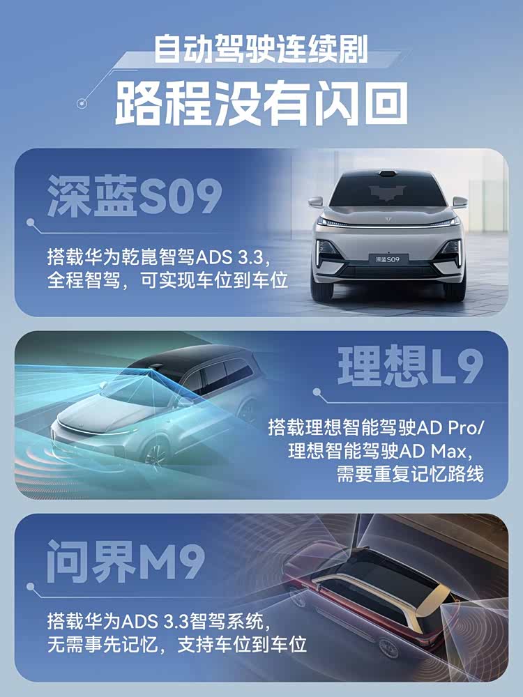 全尺寸大6座SUV领域竞争如火如荼,预估价30-35万的深蓝S09 携手理想L9、问界M9,组建“三九联盟”,成为智能驾驶领域的佼佼者。深蓝 S09 搭载先进的华为乾崑智驾ADS 3.3,其 192 线激光雷达如同车辆的“智慧之眼”,拥有 250 米的超远探测距离,每秒可精准感知 184 万点环境信息,为智能决策提供有力支持。行业内唯一商用泊车代驾VPD,能实现 “车位到车位” 的全场景智能驾驶,轻松解决停车难题。还有便捷的行业唯一离车泊入,支持障碍物挪开即停,彰显其智能优势。深蓝 S09 正以智能实力引领行业迈向新征程。