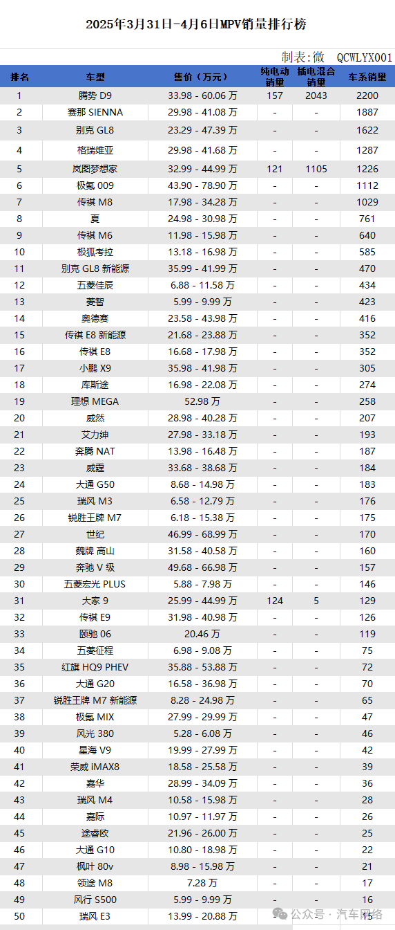 2025 年 3 月 31 日 - 4 月 6 日 MPV 销量排行榜数据为我们洞察 MPV 市场提供了关键视角。从整体销量表现来看,腾势 D9 以 2200 辆的成绩独占鳌头,其纯电动与插电混合双动力布局成效显著,纯电动销量 157 辆,插电混合达 2043 辆。这一成绩不仅反映出腾势 D9 产品力过硬,也暗示了消费者对新能源 MPV 需求的增长趋势。在销量排行榜上,紧随其后的赛那 SIENNA、别克 GL8 等传统燃油 MPV,凭借品牌积淀与市场口碑,分别收获 1887 辆和 1622 辆的销量,说明传统燃油 MPV 在当前市场仍占据重要地位,拥有稳定的客户群体,这也在一定程度上影响着汽车上牌数据与保有量数据。