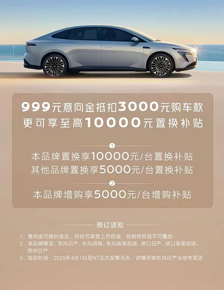 4月13日,东风 日产N7(参数|询价)开启预订,999元意向金(可退)抵扣3000元购车款,并且可享至高10000元置换补贴(本品牌置换补贴10000元/台,其他品牌置换补贴5000元/台)以及本品牌增购补贴5000元/台的权益。据悉,东风日产N7现已发运经销商门店,将于4月27日正式上市,定价20万元以内。