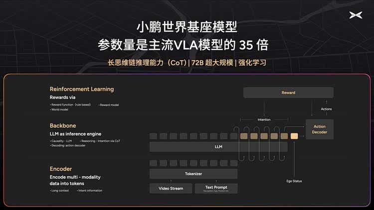 1、正在研发的“小鹏世界基座模型”是一个720亿参数的超大规模自动驾驶大模型,可以理解为一个VLA基座模型。据介绍,小鹏基模是一个以大语言模型为骨架网络、使用海量优质驾驶数据训练的多模态大模型,具备视觉理解能力、长思维链式推理能力(CoT)和动作生成能力,从而在充分理解现实世界的基础上,能够像人类一样进行复杂的常识推理,并将推理结果转化为行动。