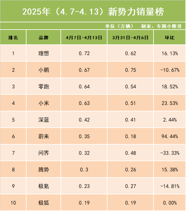 理想周销量为0.72万辆,环比上涨16.13%反超了小鹏汽车,小米差一点就能超越零跑夺得前三,不得不说现在的新势力销量榜单,越来越有看头了。