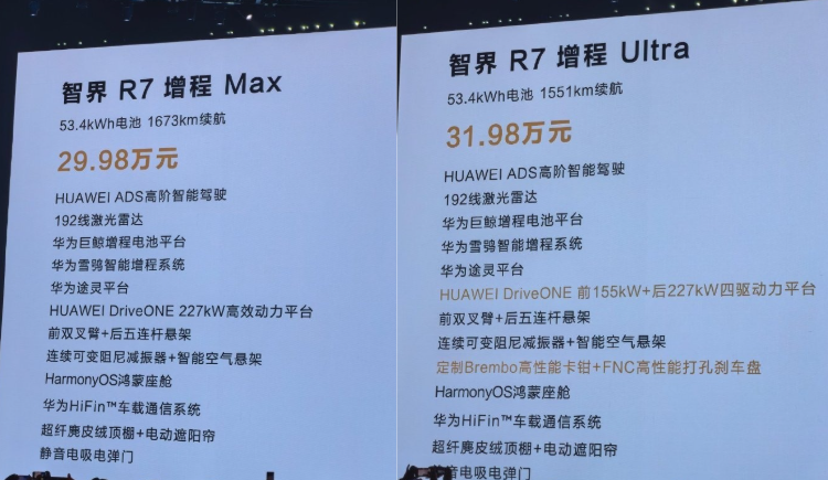 在昨天的鸿蒙智行品牌之夜活动现场, 智界R7(参数|询价)增程Max版/Ultra版迎来正式上市,指导售价分别为29.98万元、31.98万元。