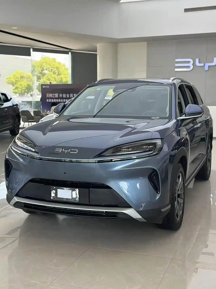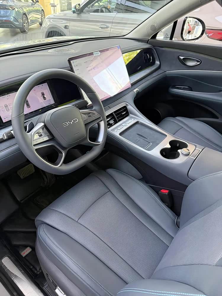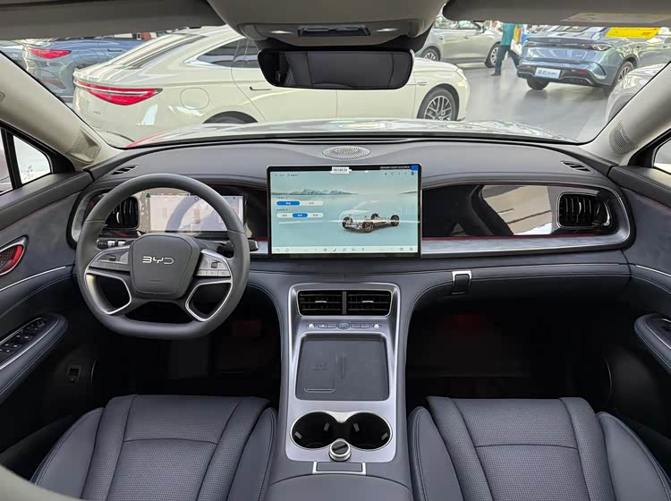 这辆车的内饰采纳了最新的家族化设计思想,在一个起伏不定的对称式中控台上,配备了15.6英寸的悬浮式中控屏和10.25英寸的内嵌式全液晶仪表盘。除此之外,该车还配备了高级智能座舱-DiLink 100,该版本不仅支持AI全场景语音交互功能,还与DeepSeek大模型进行了连接。此外,“暮色蓝”的设计理念与众多的皮质/麂皮包覆相融合,再加上四辐式多功能方向盘+怀挡式换挡机构、一体式运动座椅、50W手机无线充电和氛围灯的加持,共同打造出一种极其豪华的氛围。