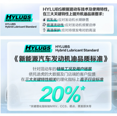 在选择机油种类时,直接留意这个带有Tiffany蓝色的HYLUBS新能源认证标识就行。专为HEV/PHEV/REEV设计的专用机油,都带有这个HYLUBS标志。就目前车主使用情况来看,使用最多的当属比亚迪全系列PHEV混动车型,其次是日系HEV车型(在广东地区保有量相当大),另外,国内一些销量不错的自主品牌增程混动车型也有不少车主选用。
