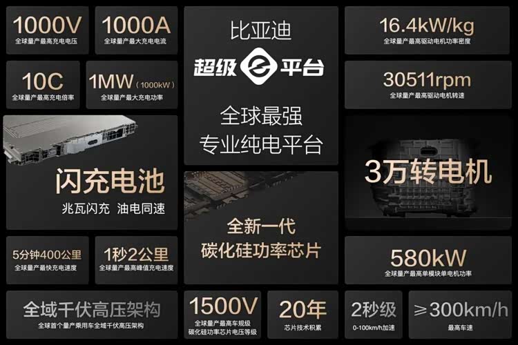 在当下,传统电动车的电压平台多在400V - 800V之间,而超级e平台直接将电压拉到1000V,配合1000A的最大充电电流,充电功率达到1MW(1000kW)。伴随着如此大的电压和电流,以往的所有高压部件都将进行强化,首先比亚迪自主研发了1500V耐压的车规级碳化硅功率芯片,重构了电池、电机、电控、充配电等所有高压部件,同时解决了高压下电、磁、热多物理场耦合的难题。