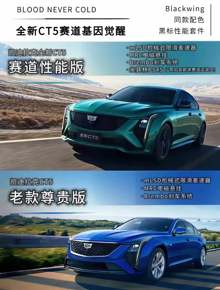 2025款CT5在外观设计上增加了一些优化,取消部分旧款配色,新增系列同款车漆“逐风蓝”和“台风绿”,提升运动感。赛道性能版标配的黑标性能套件,包括黑曜徽标、黑曜格栅、黑曜尾标和黑曜后视镜等,让整车看起来更加酷炫。前脸中网下部改为哑光设计,尾灯升级为贯穿式设计,排气口直径从60mm增至65mm,后轮距加宽至1634mm(同级最宽),提升高速过弯稳定性。