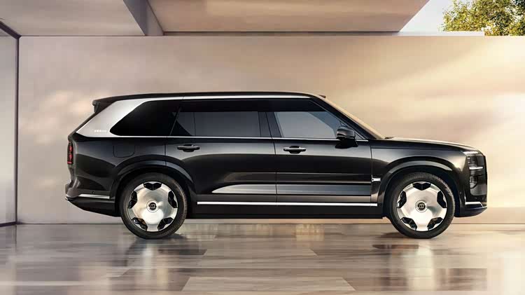 侧面来看,新车总体上比较稳重大气,营造更加高级感的视觉效果。新车车窗上、下沿与D柱均引入了镀铬饰条,并且连为一体,增强整体性。车门采用传统机械式门把手,车顶配有激光雷达;轮圈多少有些迈巴赫的影子,豪华感不错。