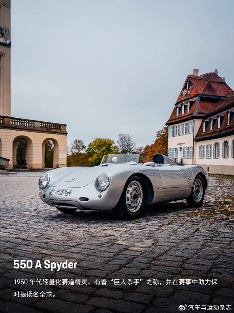 说到 550 A Spyder,首先要从其前身 550 Spyder 谈起。这款车型专为赛事打造,采用当时极为轻量化的铝制车身,发动机中置布局,以及管式车架等。同时,一经面世便在赛场中迅速脱颖而出,尤其与更高排量的赛车同场竞技时占尽先机。而后期,作为升级版的 550 A Spyder 一经推出再次震惊了世界。底盘再次升级,将车重进一步降低。其在 1956 年残酷的 Targa Florio 公路赛中首次亮相时,一举击败了奔驰、法拉利、玛莎拉蒂和捷豹等当时更知名动力更强大的竞争对手,取得全场冠军。从此,这款轻量化赛车也被人们称为“巨人杀手”。