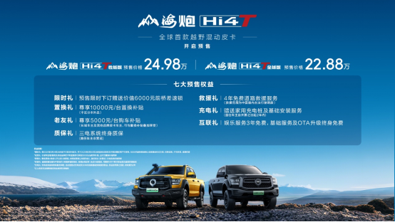 真新能源皮卡电炮来了!4月23日,“全球首款越野混动皮卡”山海炮Hi4-T正式开启全球预售。山海炮Hi4-T全球版官方预售价格为22.88万元,山海炮Hi4-T性能版官方预售价格为24.98万元,并同步推出限时礼、置换礼、充电礼等7大预售权益,价值拉满,诚意十足,保障用户用车无忧。