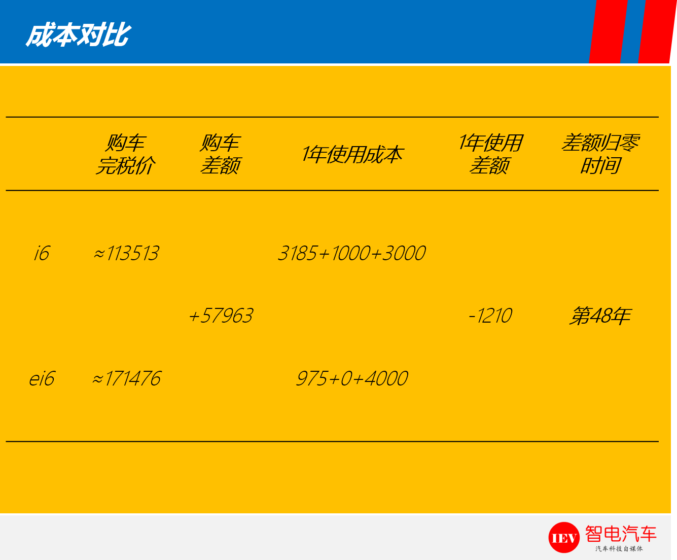再结合保险、保养等费用综合计算经济性,则在第49年能够实现两者购车、使用成本的平衡,这基本是不可能的事情,因为跑到20年左右车大多已经报废。产生这样的原因,主要是因为i6本身拥有过硬的油耗表现,同时ei6的保险费用偏高,减小了两者的使用成本差距。