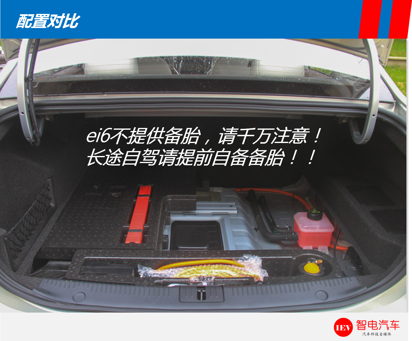底盘和配置方面,由于两者是共用平台,均采用了前麦弗逊+扭力梁式非独立悬挂的承载式结构,但ei6则没有配备胎!没有配备胎!没有备胎!重要的话说三遍,它的后备厢改成了充电设备放置处,因此,想长途自驾的,一定要特别注意了!