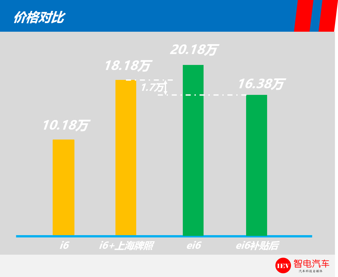 但在上海地区,新能源汽车相比传统燃油车能省8万元免牌待遇,因此实际上ei6反而省了1.7万元左右。