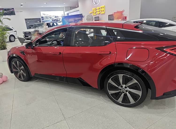 车侧一面,作为一款跨界SUV定位的产品,使其车身的整体结构显得比较低趴;加之大幅度的溜背布局以及包含侧裙、腰线在内的尖锐线条以及隐藏式门把手、双色回旋样式半密闭式轮毂等细节处理,则让其侧颜充斥着未来感十足的酷炫成分。