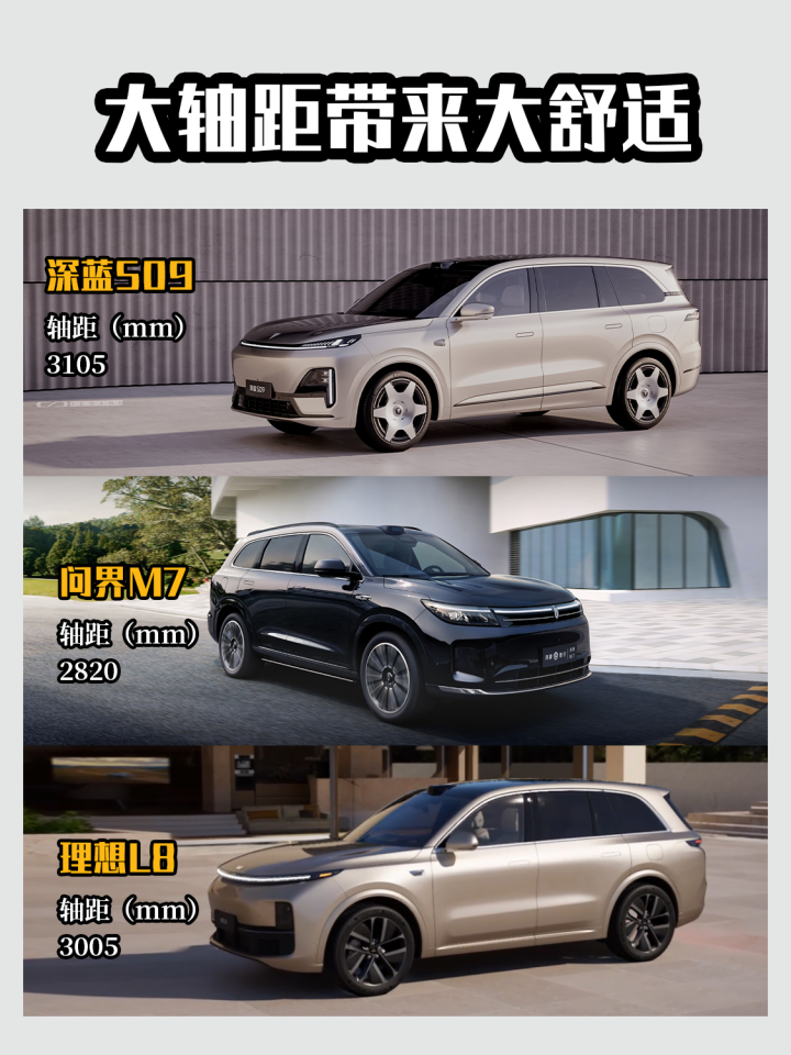 倘若,拿深蓝S09四驱Ultra+高定版与同价位的理想L8和问界M7对比,理想L8和问界M7的轴距分别为3005mm和2820mm,后备厢容积分别为313-1098L和188-775L,单论空间表现,显然是深蓝S09更胜一筹。