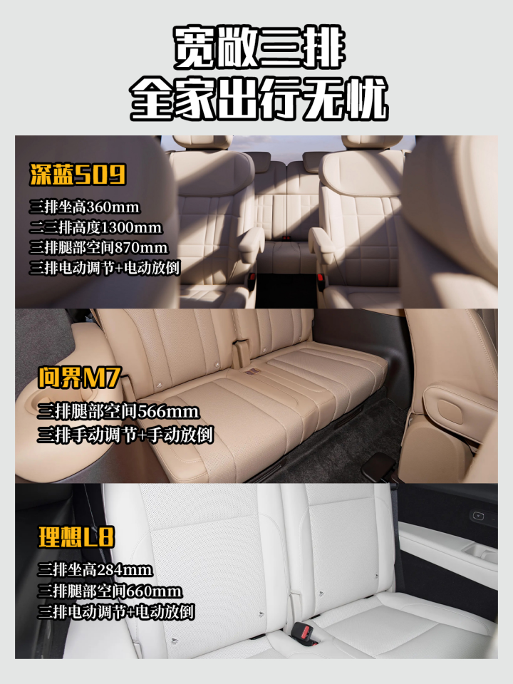 相较之下,问界M7和理想L8的第三排腿部空间仅有566mm和660mm,局促的空间表现,只能充当短途应急的“陪衬”,可深蓝S09却能够给坐在第三排的父母,提供惬意的乘坐体验,这般表现在业界也绝对是遥遥领先的。