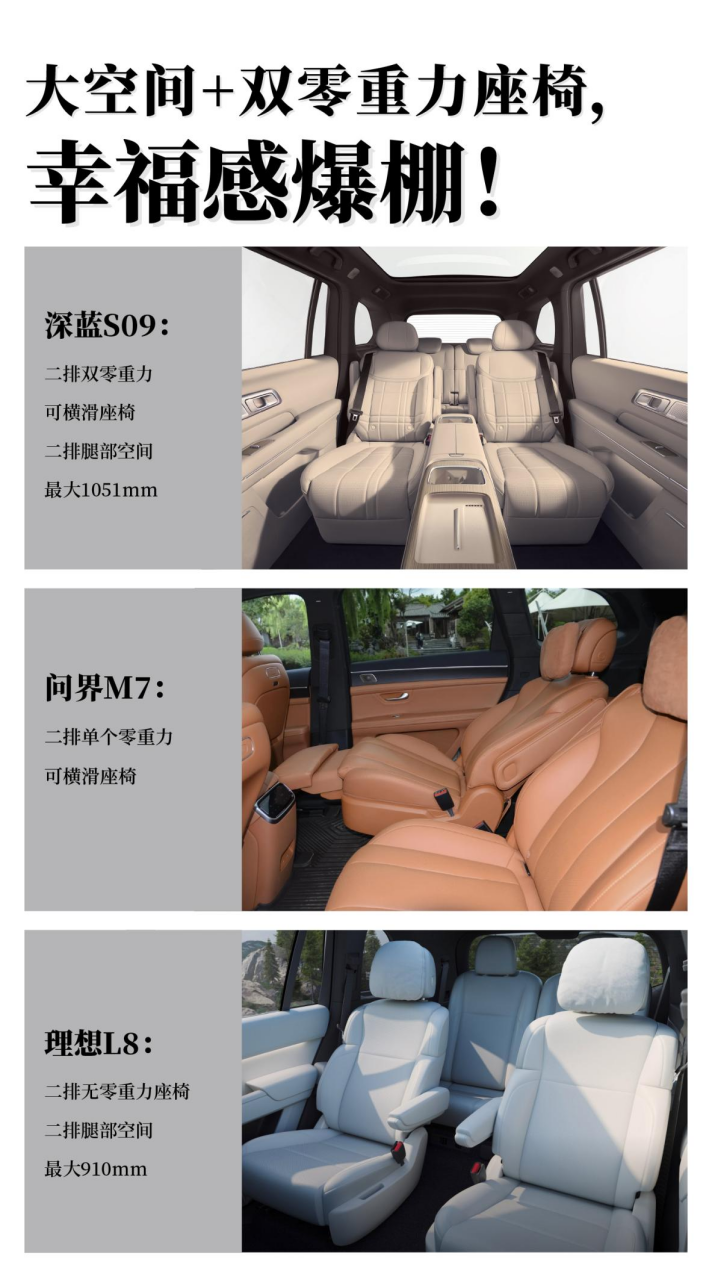 相较之下,问界M7的第二排仅配备了单个零重力座椅,虽然也能够进行滑移,可整体舒适度还是要差一些。理想L8的第二排甚至都没有配备零重力座椅,910mm的最大腿部空间不算小了,可不支持滑移,日常的空间利用率定然不如深蓝S09,乘坐体验相对也没有那般舒坦。
