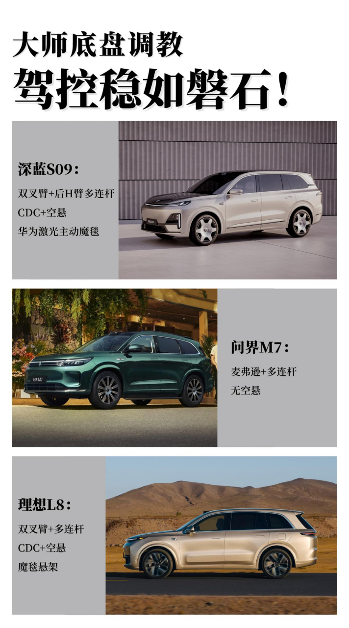 底盘方面,深蓝S09搭载了铝合金双叉臂独立悬挂+后H臂多连杆独立悬挂、空气悬和CDC等高端硬件,更有全场景智慧控制的魔毯悬架,能够有效滤过路面的各项震动,为车内的乘客提供惬意舒心的驾乘体验,比起未搭载空气悬架的问界M7,以及仅配备后多连杆独立悬架的理想L8,在舒适度和操控层面必然要更胜一筹,亦能媲美百万元级别的豪车。
