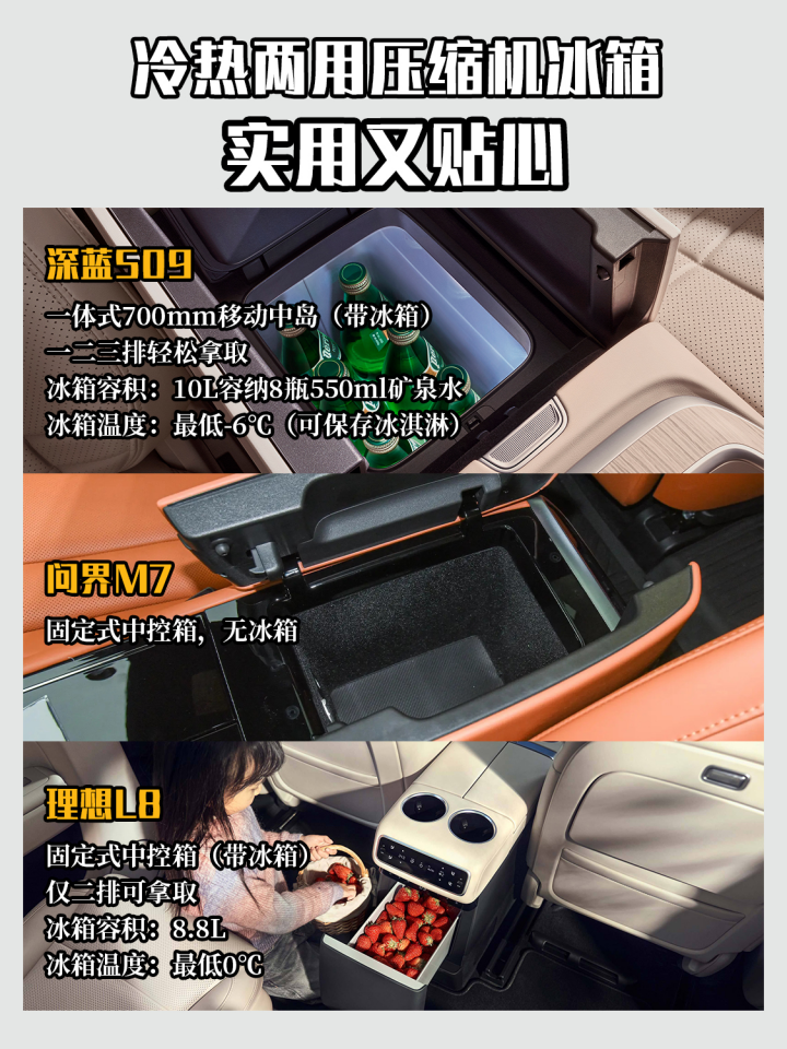 同时,智能移动中岛不但可以方便第二、三排乘客拿取物品,而且还可以通过挪动位置,使得第一二排乘客可以在狭窄车位内轻松完成上下车,无疑是一个非常贴心的设计。对比问界M7无冰箱的固定式中控箱,乃至于理想L8仅能支持最低0℃的“小冰箱”,深蓝S09显然能够提供更丰富的情绪价值。