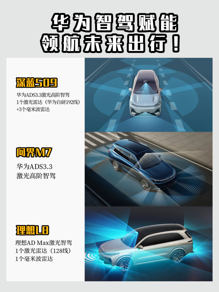 从硬件设备上来看,虽然深蓝S09和问界M7均搭载了华为乾崑智驾ADS 3.3系统,但是深蓝S09搭载了华为自研的192线激光雷达,在感知系统上更胜一筹,对比理想L8仅仅128线的激光雷达,乃至于仅配备的1个毫米波雷达,表现也要更好一些。而更硬核的感知设备,也必会为深蓝S09带来智驾辅助体验上的优势。