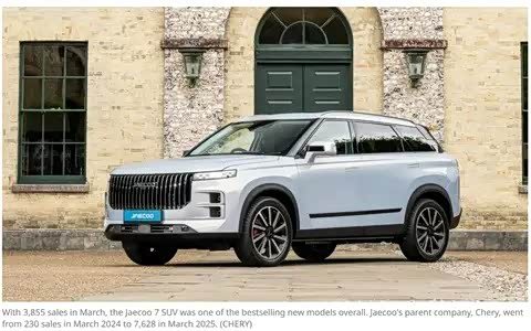 而跳出新能源的维度看,3月份欧洲汽车销量增长2.8%,增量贡献最大的是中国品牌。不只新能源,燃油车同样增长迅猛。比如捷途,按照当地媒体的说法,Jaecoo 7 SUV在3月份的销量为 3,855 辆,是整体上最畅销的新车型之一。Jaecoo 的母公司奇瑞的销量从 2024年3月的230辆增加到2025年 3月的7,628辆。这只用了一年时间。