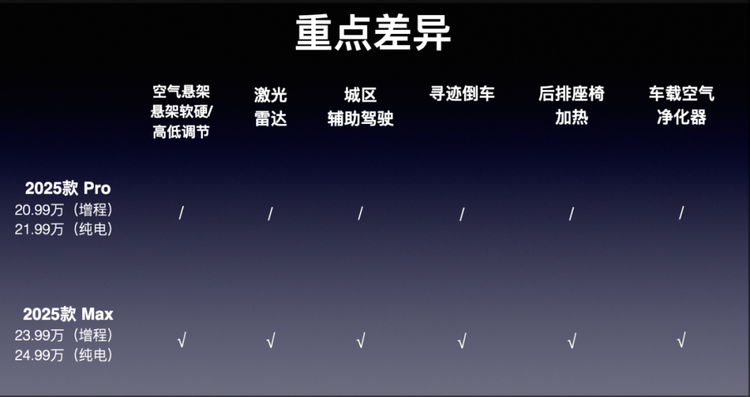选择有且仅有低配和中配车型,3万元的价差主要是城区智驾和空悬两个主要配置,以及后排座椅加热等不是那么重要的舒适性配置。dodo建议对两个“主要配置”都有需求的朋友才选择2025款 Max增程版,否则都选2025款 Pro增程版。