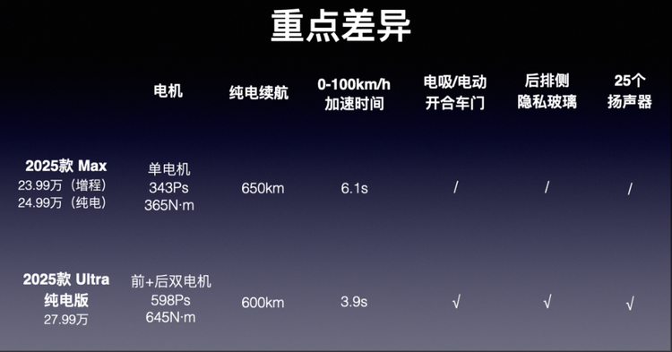 顶配的Ultra只有纯电版,相比Max纯电版,采用双电机之后,它的动力提升明显,配置上增加了前排电吸门、自动开合车门、后排侧隐私玻璃以及25个扬声器。