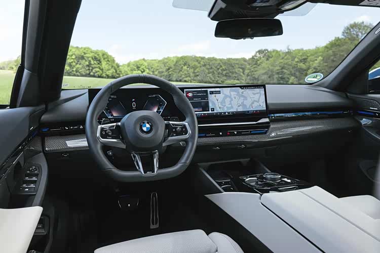 这样一来,你就可以安心地靠在那剪裁舒适但位置稍高的座椅上,看着那朝向驾驶者弯曲的显示屏了。在这块显示屏上,宝马应用了如今信息娱乐领域所有的前沿技术,甚至还包括一些游戏。当然了,只有在车辆静止时才能通过手机应用程序在屏幕上玩这些游戏。不过,这项功能或许在电动版的BMW 5系上能更好地发挥作用,毕竟电动版还涉及到要打发充电时间的问题。虽说有这么多好玩的东西,但遗憾的是,旋转按钮在菜单操作时不再像以前那样直观了,而且那回旋镖形状的显示内容也不太容易看清。此外,传统的宝马车主还会怀念那些实用的驾驶模式、一些实体开关、可自由定义功能的按键以及独立的空调控制系统。